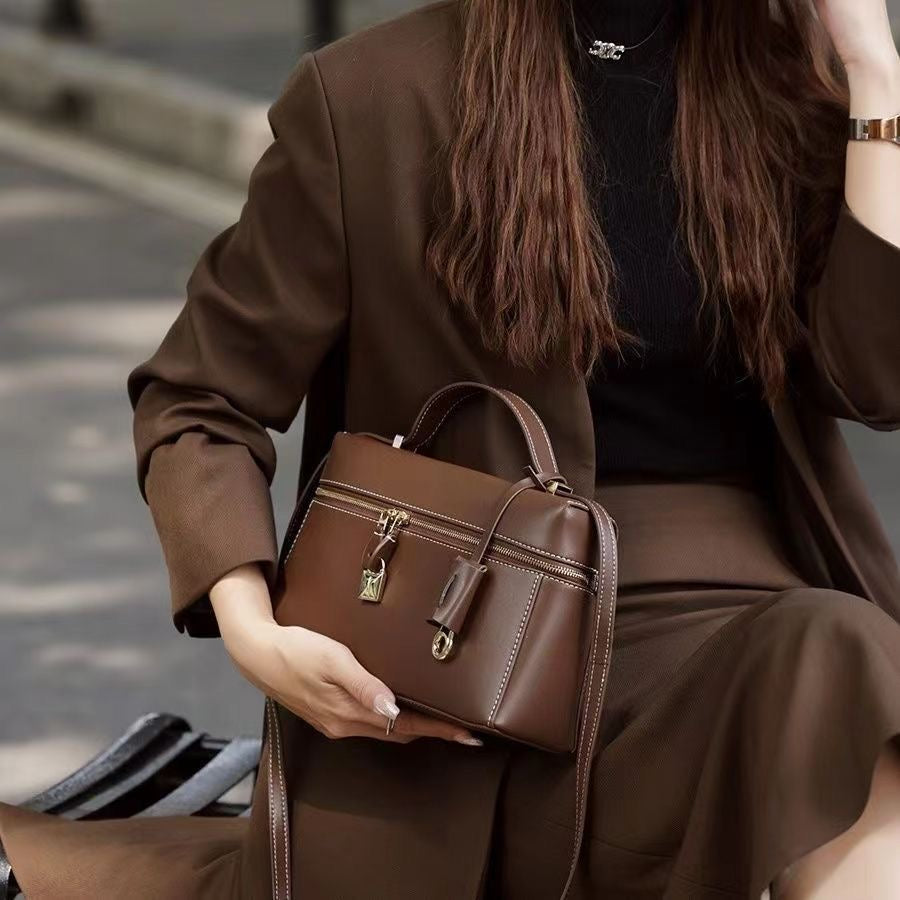 ☕ Conçu pour la femme moderne et active, ce sac à main structuré en cuir moka allie élégance et praticité. Doté de finitions dorées, de compartiments zippés sécurisés et d'une bandoulière amovible, c'est l'accessoire indispensable pour le bureau comme pour les soirées.